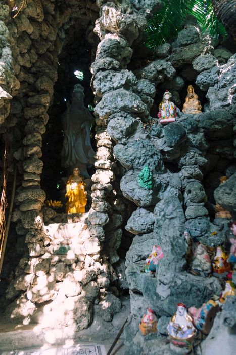 Chùa Từ Vân rộng lớn với nhiều tháp, động, tượng làm từ san hô, vỏ ốc như đôi rồng từ Ngũ Hành Sơn, tượng voi, rùa... Mỗi tác phẩm đều là biểu tượng của nghệ thuật tinh tế.