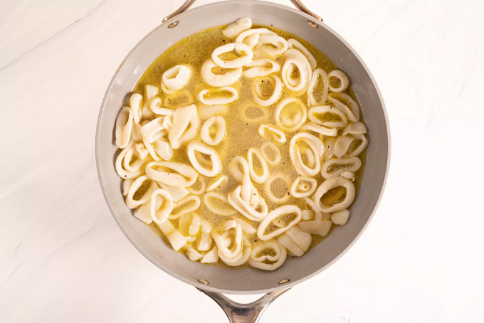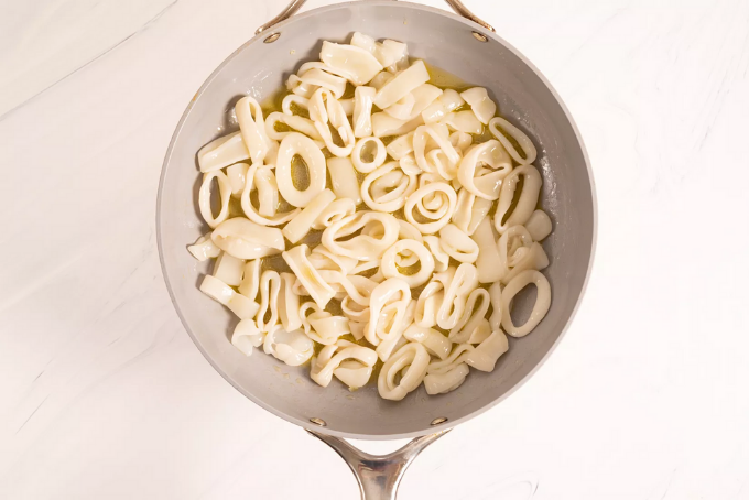 Đun nóng 1/4 cốc dầu ô liu trong chảo, sau đó đưa mực vào xào trong 5 phút.
