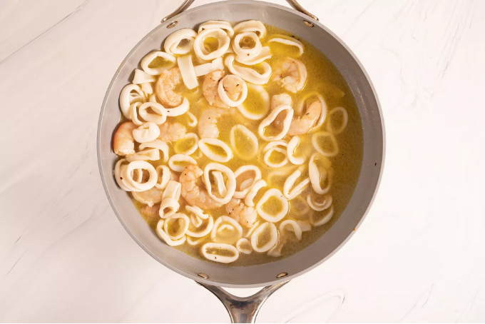 Đặt tôm vào chảo cùng với mực và nấu trong 3 phút.