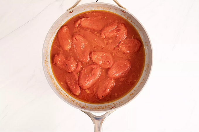 Cho cà chua và rượu trắng vào. Đun nhỏ lửa trong 30 phút, gia vị với muối và tiêu.