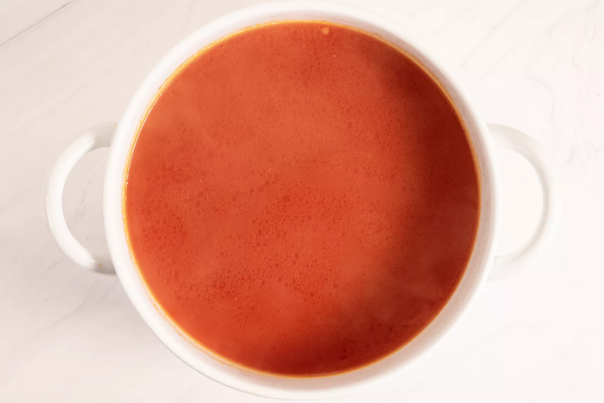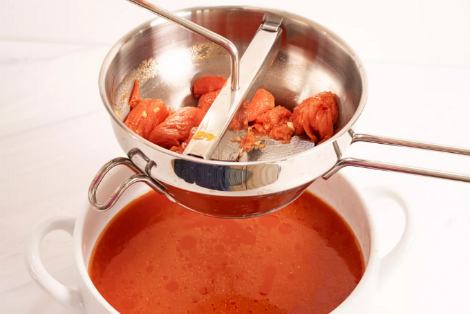 Lọc nước cốt từ cà chua đã nấu, ép để lấy nước cốt.