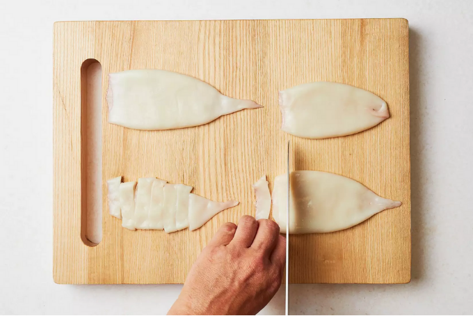 Mực được sơ chế sạch, đặt mực nằm ngang trước mặt bạn trên thớt. Sử dụng một con dao sắc và cắt thành từng khoanh tròn rộng khoảng 1 cm