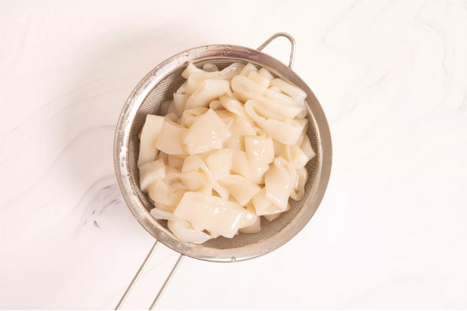 Trong lúc đó, để mực ráo và rửa sạch dưới vòi nước lạnh.