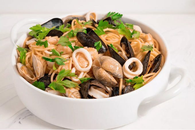 Mì Ý hải sản là sự kết hợp độc đáo của những sợi mì Ý dai ngon, vàng ươm cùng với tôm, mực, trai, nghêu, sò... tạo nên một hương vị thơm ngon và quyến rũ đặc biệt. Bữa ăn sáng với món mì Ý hải sản này sẽ đem lại năng lượng tràn đầy để bắt đầu một ngày mới.