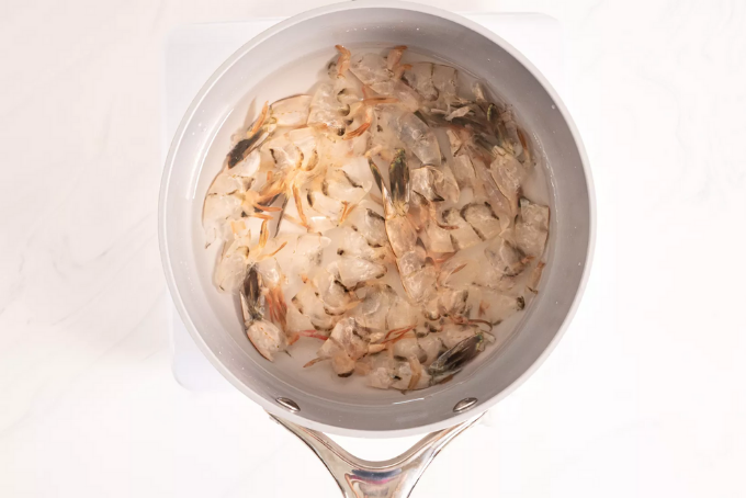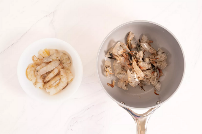 Đặt tôm vào một bát nhỏ và thêm cả vỏ vào nồi đun nhỏ lửa. Đổ 2 cốc nước lạnh vào vỏ, đặt nồi trên lửa vừa và đun nhỏ lửa trong 30 phút.