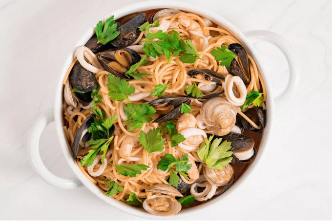 Công thức chế biến món mì hải sản tươi ngon này kết hợp tôm, mực, nghêu, trai trong nước sốt cà chua tỏi, được phục vụ với mì ống theo phong cách Ý. Đây là món ăn hoàn hảo cho dịp đặc biệt hoặc bữa tối lãng mạn. Hãy thưởng thức mì Ý hải sản cùng bánh mì giòn và rượu vang!
