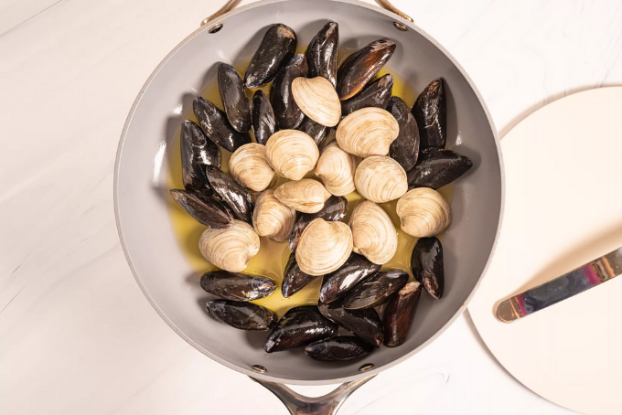 Sau khi nấu mì ống, hãy vớt trai và nghêu ra, rửa sạch dưới vòi nước lạnh. Đổ dầu ô liu vào chảo lớn, đậy nắp và đun lửa trong 10 phút. Loại bỏ bất kỳ con trai hoặc nghêu nào chưa mở.