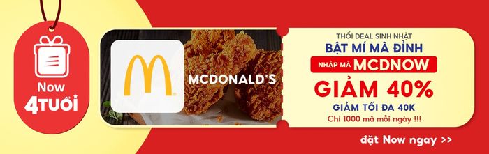Mỗi năm chỉ có một lần sinh nhật, Now gửi lời cảm ơn đến McDonald’s đã mang đến chuỗi cửa hàng hiện đại với đồ uống chất lượng. Nhận mã “MCDNOW” GIẢM 40% tối đa 40k, chỉ dành cho 1000 khách hàng nhanh nhất.