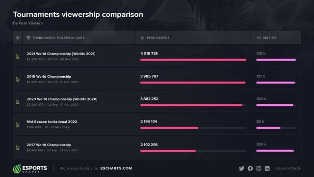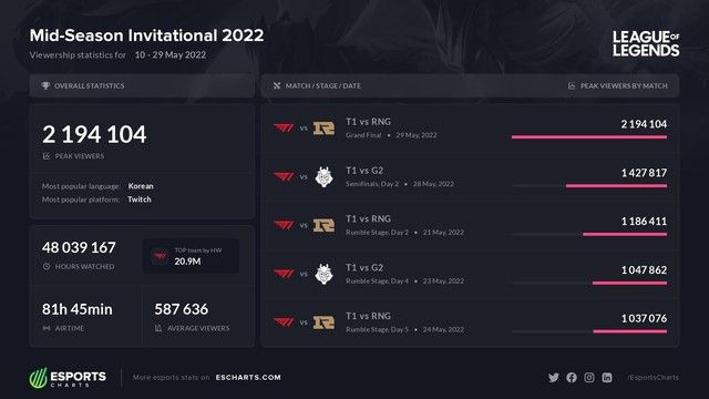 MSI 2022 vẫn giữ được sức hút của mình, đặc biệt là trong trận Chung kết có lượt xem lên đến 2,194,104, theo thống kê từ Eschart. Đây là con số cao nhất từ trước đến nay, đánh bại mọi kỷ lục trước đây của các trận Chung kết MSI, kể từ khi giải đấu bắt đầu vào mùa giải 2015. Điều đặc biệt, con số này không tính cả lượt xem từ Trung Quốc - nơi có thể có lượng người xem 'khủng' hơn nhiều. Đây cũng là cuộc đối đầu giữa 'đại diện tự hào của LPL' RNG và đội có số lượng fan đông đảo nhất thế giới - T1.