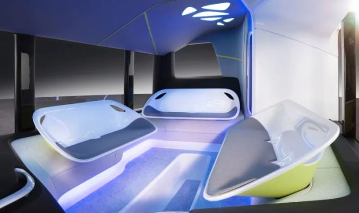 Why are future interiors always in colors like purple and blue? Credit: Mercedes BenzGhế được sắp xếp dọc theo các bức tường theo các nhóm không đối xứng. Các ghế là vỏ trắng với lớp đệm.