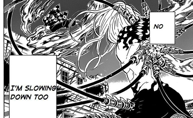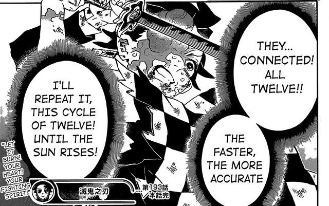 Trong khi đó, Tanjirou vẫn cố gắng thể hiện Hơi thở Mặt Trời nhanh chóng và chính xác hơn để có thể sáng tạo ra thức thứ 13. Dù thể lực sắp cạn kiệt, Tanjirou vẫn kiên định. Kết thúc chương, khó có thể xác định bên nào chiếm ưu thế hơn, khi Muzan đang yếu dần do tuổi tác trong khi Tanjirou chưa đủ mạnh như Yoriichi để kết liễu Muzan ngay lập tức.