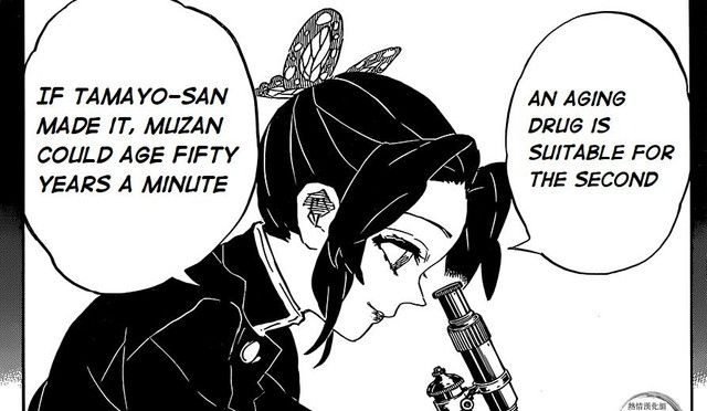 Nhận ra điều này, Muzan chưa kịp vui mừng thì bắt đầu chuyển động chậm lại. Muzan liền gọi Tamayo và qua đó biết, Tamayo và Trùng Trụ Shinobu đã hợp tác để tạo ra loại thuốc. Theo đó, Trùng Trụ đã nâng cấp hiệu quả của thuốc lên mức lão hóa Muzan với tốc độ năm mươi tuổi mỗi phút.
