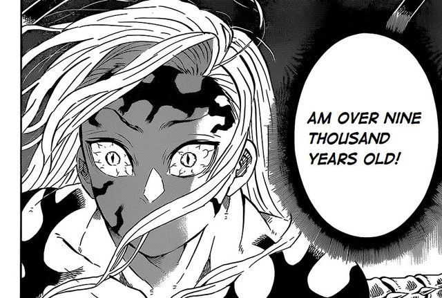 Từ khi tiêu diệt Tamayo cho đến nay, Muzan đã chịu nhiều trận chiến đối đầu với các Trụ cột trong hàng giờ liền. Trong khoảng thời gian đó, gã đã già đi và dần suy yếu. Theo tính toán của Muzan, thuốc đã phát huy tác dụng trong 3 tiếng nên gã đã đạt mốc 9000 tuổi. Muzan có thể nhận ra điều này sớm hơn bởi tóc gã đã bạc trắng từ lâu và không thể phục hồi như trước nữa.