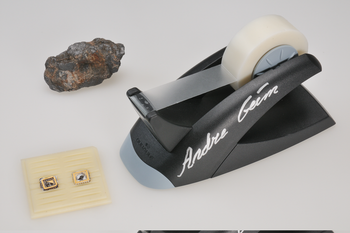 The researchers donated graphite, tape, and a graphene transistor to the Nobel Museum. Credit: Gabriel HildebrandThế giới khoa học rộn ràng với sự hứng thú. Graphene là vật liệu mỏng nhất được biết đến trong vũ trụ, mạnh nhất đã từng được đo lường, dai hơn cao su và dẫn điện hơn đồng.