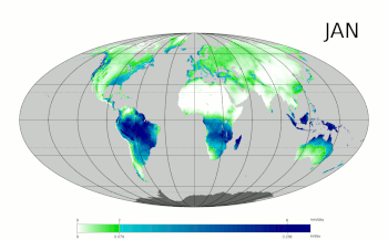 Hình ảnh lý tưởng hóa của lưu thông khí quyển toàn cầu trên hành tinh chúng ta.Lượng mưa trung bình theo từng tháng trong một khoảng thời gian dài