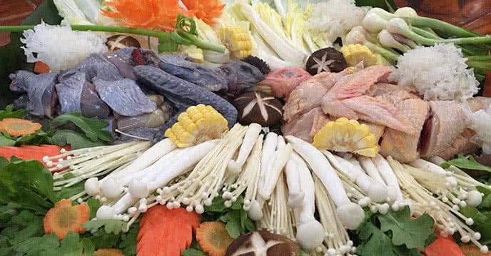 Một Đĩa Nhúng Trong Món Lẩu Uyên Ương Bao Gồm Một Đôi Gà Ác và Gà Ri Đồng Được Bài Trí Một Cách Đẹp Mắt