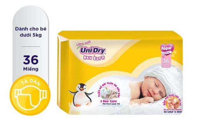 Loại tã dán sơ sinh được biết đến với tên gọi đầy đủ là Unidry Newborn Ultra Soft, viết tắt là NB36. Đây là sự lựa chọn tốt nhất cho trẻ mới sinh dưới 1 tháng tuổi hoặc những bé có cân nặng dưới 5kg. Gói sản phẩm này chứa 36 miếng bỉm dán và được thiết kế với sự mềm mại tối đa, khả năng thấm hút cao và có vạch báo đầy để mẹ có thể thay tã cho bé đúng thời điểm.