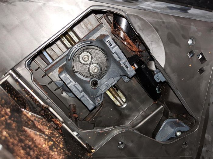 Jeff Van CampInside the DeLonghi Magnifica during cleaning (brew unit removed)DeLonghi Magnifica có cà phê trong bên trong, và thậm chí có một vài hạt bụi trong vài ốc vít và bộ phận cơ khí (tại sao chúng lại được mở ra?) trong máy. Cây chải nhỏ đi kèm giúp tôi quét hết nó đi, như một nhà khảo cổ trong một bộ phim phơi bày xương khủng long, nhưng tôi lo lắng rằng bụi cà phê sẽ xâm nhập nhiều hơn vào cơ khí theo thời gian. Tôi không biết các bộ phận chuyển động tinh tế sẽ xử lý nó như thế nào. Tôi cũng không hút sạch bên trong (được khuyến nghị bởi sách hướng dẫn) vì tôi không có máy hút bụi có đầu nối ống.