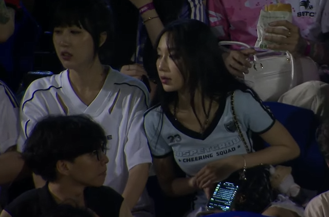 Bên cạnh Mina Young, camera cũng ghi lại hình ảnh của Mai Quỳnh Anh - vợ của streamer, YouTuber Cris Phan. Cô nàng hòa mình vào không khí cuồng nhiệt của các trận đấu và nhiệt tình cổ vũ cho ông xã.
