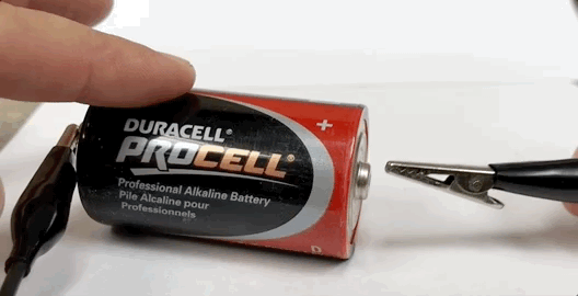 Tuy nhiên, có nhiều trường hợp mà một tia lửa được tạo ra ngay cả với điện áp thấp. Để hiểu điều này, hãy nhìn vào một mạch điện đơn giản—mạch điện đơn giản nhất bạn có thể tưởng tượng. Nó bao gồm một pin và một sợi dây. Đó là tất cả. Dưới đây là cái mà đó có thể trông giống như thực tế.