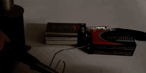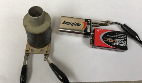 Có hai sự khác biệt đáng chú ý với mạch điện thứ hai này. Thứ nhất, tôi đang sử dụng hai pin 9 volt thay vì một pin D-cell (với chỉ 1.5 volt). Thứ hai, tôi có một thiết bị khác trong mạch này—một cuộn dây (ở bên trái). Chúng ta gọi đó là một cuộn tụ điện.