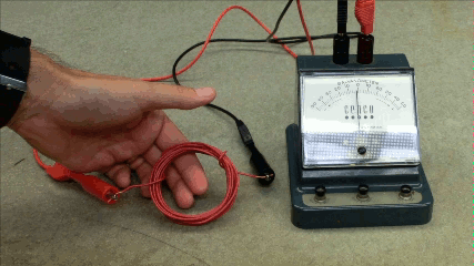 Thiết bị ở bên phải thực sự là một máy đo nhạy để phát hiện dòng điện (gọi là galvanometer). Nếu bạn nhìn kỹ, bạn có thể nhận thấy rằng có một dòng điện được tạo ra khi nam châm di chuyển—không chỉ khi có một trường từ. Phải có một trường từ biến đổi để tạo ra một dòng điện. Nhưng nếu tôi thay thế nam châm di chuyển này bằng một cuộn dây có một dòng điện đang biến đổi chạy qua nó? Nó có thể tạo ra hiệu ứng giống như nam châm di chuyển.