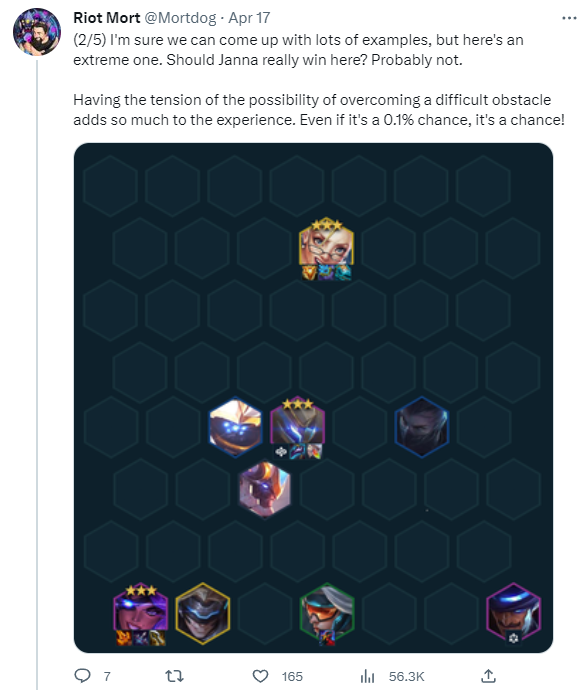 Riot Mortdog cũng cho biết, ông muốn mọi đội hình và tướng đều mang lại cơ hội cho người chơi đối thủ. Ông nhấn mạnh rằng, sự sáng tạo từ người chơi mới thực sự là chìa khóa cho sức hấp dẫn của Đấu Trường Chân Lý.