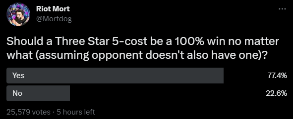 Mới đây, Riot đã tiến hành một cuộc khảo sát về tướng 5 vàng trong Đấu Trường Chân Lý. Cuộc khảo sát do Riot Mortdog - Giám đốc dự án Đấu Trường Chân Lý thực hiện. Một trong những câu hỏi đặt ra là: 'Có nên cho phép tướng 5 vàng 3 sao tự động chiến thắng 100% không?'. Gần 80% người tham gia khảo sát đã chọn 'Có'.