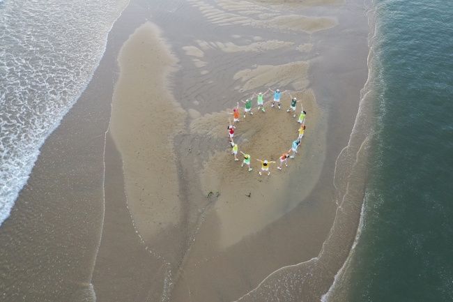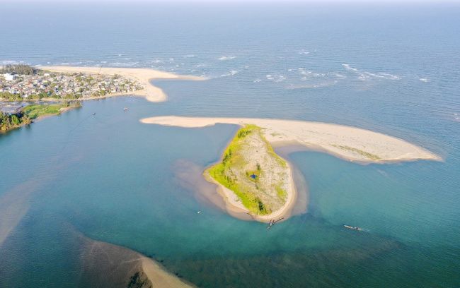 Cồn cát mới nổi sát chân cầu Cổ Lũy tạo hình trái tim dài hàng chục mét, gần khu vực Cửa Đại - điểm gặp nhau của sông Trà Khúc và biển.