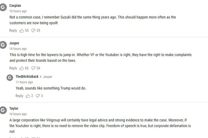 Người đọc có tên gọi Taylor đã để lại ý kiến trên trang Autoblog: 'Một tập đoàn lớn như VinGroup chắc chắn sẽ có tư vấn pháp lý và bằng chứng đầy đủ để chứng minh vụ việc. Hơn nữa, nếu Youtuber nói đúng thì không cần phải xóa video clip. Quyền tự do ngôn luận là có, nhưng việc phỉ báng công ty là không thể chấp nhận được'.