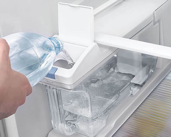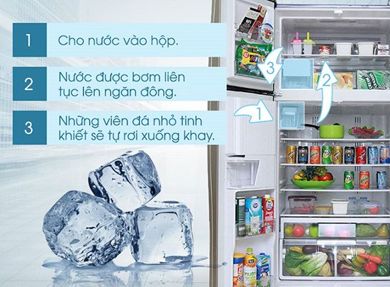 Bên trong tủ lạnh có chức năng tự động làm đá có một khu vực riêng biệt dành cho hộp chứa nước kèm theo máy bơm hỗ trợ. Khi bạn đổ nước vào hộp chứa, nước sẽ tự động được bơm lên khay đá để làm lạnh và khi nước đã đông lại thành đá, hệ thống sẽ xoay khay đá để đá rơi vào hộp chứa. Bạn chỉ cần nhấn nút trên bảng điều khiển để lấy loại đá mà bạn muốn, thông thường có 2 loại là đá viên và đá bào.