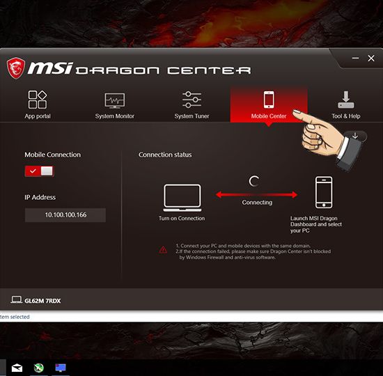 Step 3: Launch the 'Dragon Center' application, go to 'Mobile Center' and enable 'Mobile Connection'.