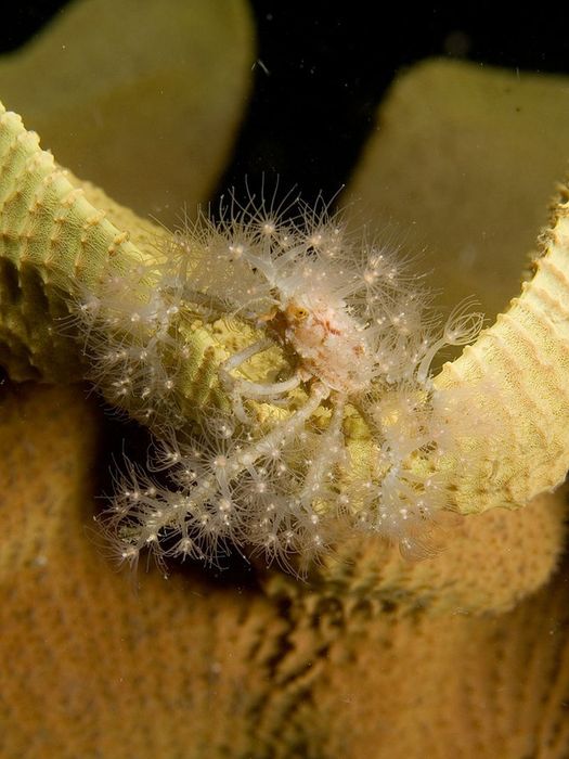 Các loài cua trang trí khác thậm chí còn tận dụng lợi thế của loài thủy sinh Hydrichthella epigorgia, giống như san hô, được tạo thành từ vô số polyp nhỏ hoạt động như một cơ thể tập thể. Một số loài tinh ranh đã gắn chúng vào càng để tạo ra một cặp cần câu dính và hiệu quả.