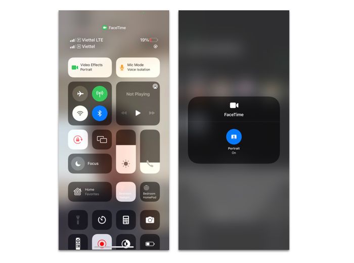 Khi bạn đang trong cuộc gọi FaceTime, chỉ cần kéo Control Center xuống và nhìn vào góc trên bên trái, bạn sẽ thấy tính năng làm mờ phông (Video Effects) và có thể kích hoạt hoặc tắt chức năng này tại đây.
