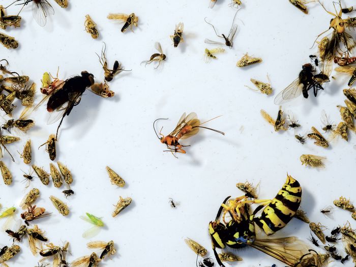Chiếc lọ chứa một nước dùng mảnh, màu nâu nhạt, với một số đồ vật không chắc chắn đang nổi trên trên—một loại súp, có lẽ, nhưng bạn sẽ không bao giờ muốn ăn. Khi đổ vào một khay nhựa trắng, những miếng đồ vật hóa thành côn trùng. Đây là bướm và bướm đêm, các họa tiết tinh tế trên cánh của chúng bị mờ đi sau một hoặc hai tuần trong ethanol. Đây là bọ cánh cứng và ong mật và nhiều loại ruồi mạnh mẽ khác, tất cả đều được xếp chồng lên nhau, cùng một đám ong lớn, vẫn sáng sủa với những vằn và đầu chọc của chúng.