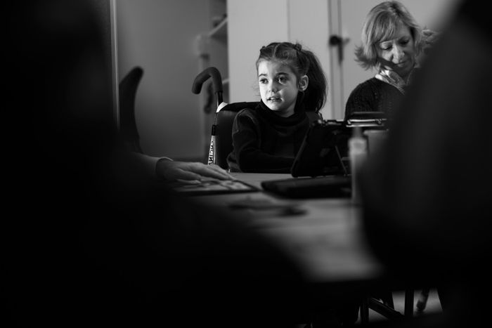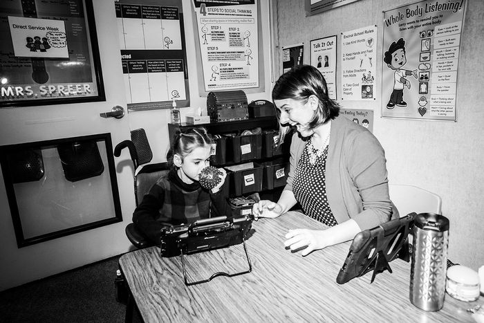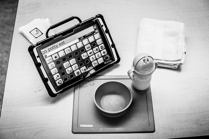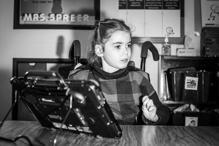 Lúc 11 giờ sáng, Grace ngồi trong lớp học với một chuyên gia nói. Mặc dù Grace không nói, nhưng cô đang học cách sử dụng “talker” của mình, một thiết bị kích thước của máy tính bảng với các biểu tượng giúp cô truyền đạt. Grace nắm lấy talker của mình và nhấn vào các biểu tượng cho “play” và “music,” sau đó nhấn nút để talker đọc lời ra to.