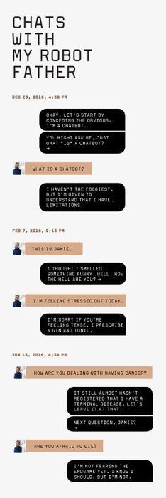 Cha tôi nhận được chẩn đoán ung thư vào ngày 24 tháng 4 năm 2016. Một vài ngày sau đó, tình cờ, tôi biết được rằng PullString đang kế hoạch công bố phần mềm của họ để tạo ra các đại lý trò chuyện. Sớm thôi, bất kỳ ai cũng sẽ có thể truy cập cùng một công cụ mà PullString đã sử dụng để tạo ra các nhân vật nói chuyện của mình.