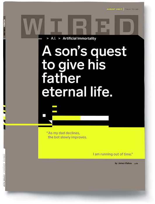 Tóm lại, tôi trở nên ám ảnh. Tôi có thể tưởng tượng giới thiệu ngắn cho bộ phim này: Người đàn ông mê mải về cha ông ta đang cố giữ ông ta sống bằng cách biến ông ta thành robot. Câu chuyện về tổng hợp cuộc sống đã tồn tại hàng thiên niên kỷ, và mọi người đều biết rằng chúng kết thúc không tốt. Hãy chứng kiến thần thoại Hy Lạp về Prometheus, những câu chuyện dân gian Do Thái về golems, Frankenstein, Ex Machina, và The Terminator. Dadbot, tất nhiên, không có khả năng hoành hành qua vùng đất đổ nát hậu Singularity. Nhưng có những nguy hiểm tinh tế hơn cả mối đe dọa của một cuộc chiến tranh giữa robot. Đó là sự tự trọng lúc tỏ tường của tôi đang được đặt vào rủi ro. Trong những khoảnh khắc tối tăm, tôi lo lắng rằng mình đã đầu tư hàng trăm giờ tạo ra một cái gì đó mà chẳng ai, có lẽ thậm chí là tôi, sẽ muốn sau cùng.