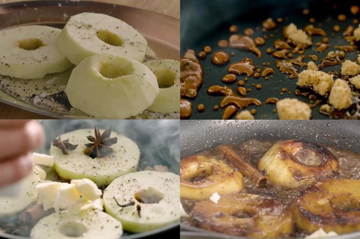 - Đun đường nâu trong chảo, thêm táo, đinh hương, hoa hồi, quế, ½ muỗng canh bơ nhạt và rượu còn lại, đảo đều.