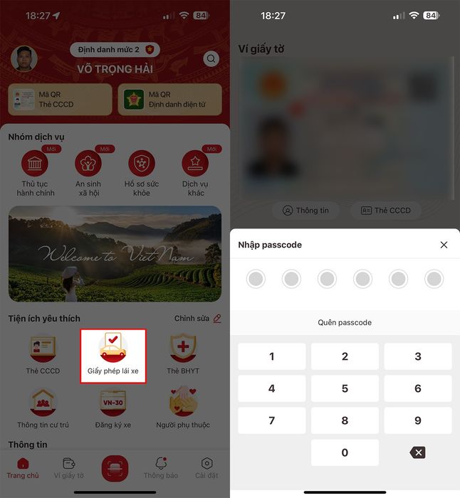 Bước 3: Tìm và chọn mục Giấy phép lái xe > Nhập mã Passcode hoặc sử dụng sinh trắc học (vân tay, khuôn mặt) để xác thực.