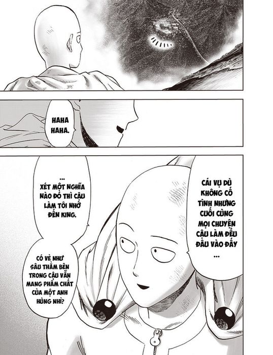Saitama tự nhận ra rằng Garou đang cố tấn công nhưng lại vô tình cứu người, khiến anh nhớ đến King, người cũng thường xuyên 'vô tình' làm anh hùng.
