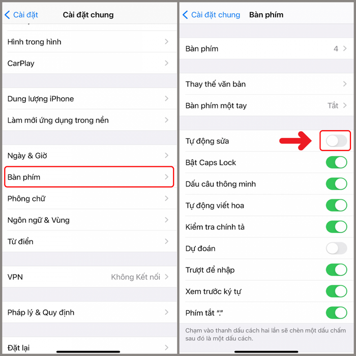 - Bước 2: Nhấn vào Bàn Phím, tìm mục Tự động sửa và kéo thanh trượt sang trái để tắt chế độ sửa lỗi chính tả trên iPhone.