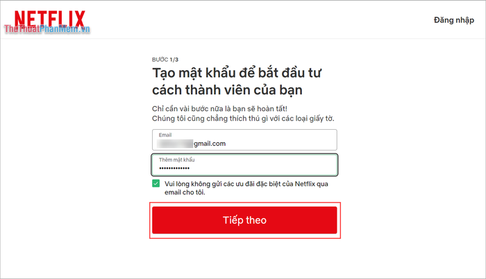 3. Bước tiếp theo: Lựa chọn Tiếp theo để đăng ký tài khoản Netflix.