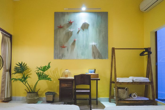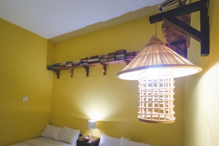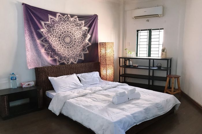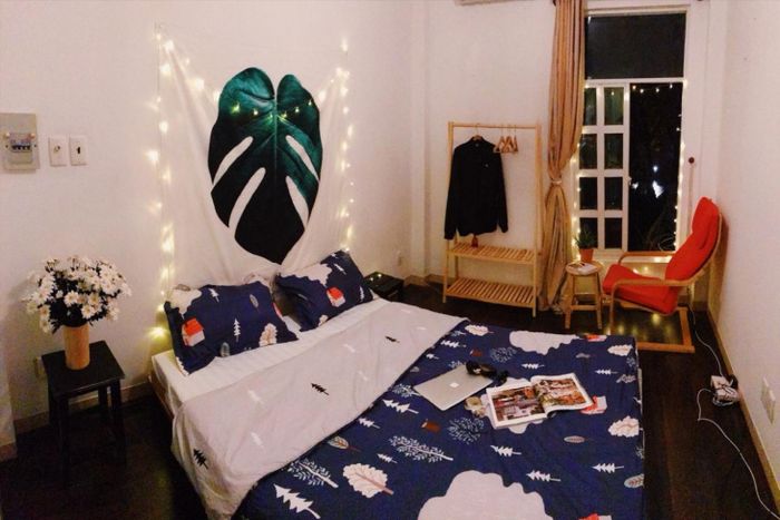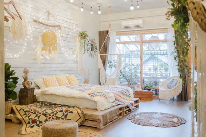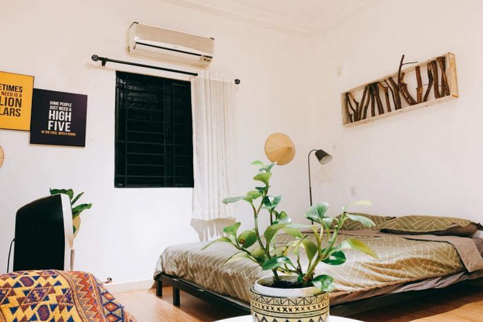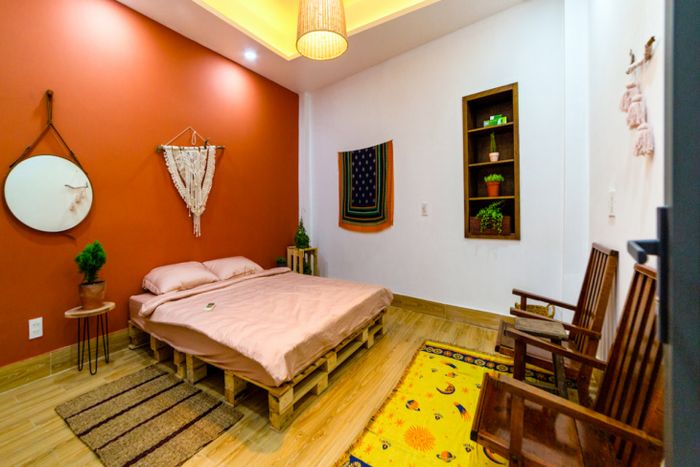 Là một người hâm mộ phong cách Bohochic, tôi đã đắm chìm ngay từ cái nhìn đầu tiên vào homestay này. Căn phòng không quá rộng lớn, nhưng cách bài trí rất độc đáo và thoải mái. Có gương và giá để giày là những tiện ích quan trọng, tô điểm cho không gian.