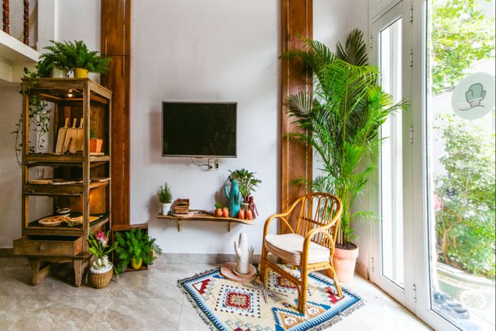 Không gian phòng được bao phủ bởi sắc xanh của cây cỏ