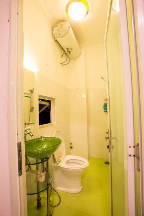Phòng tắm nhỏ nhưng đậm chất tự nhiên với màu xanh lá cây nổi bật