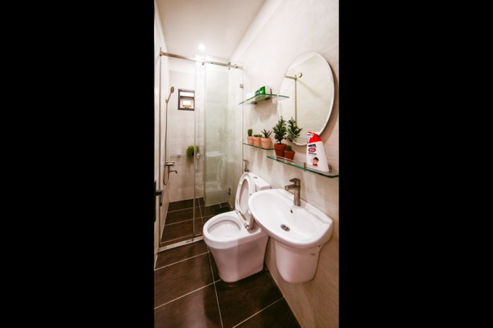Phòng tắm tại đây được thiết kế với cửa kính tạo độ riêng tư cho khu vực tắm và vệ sinh bên ngoài.