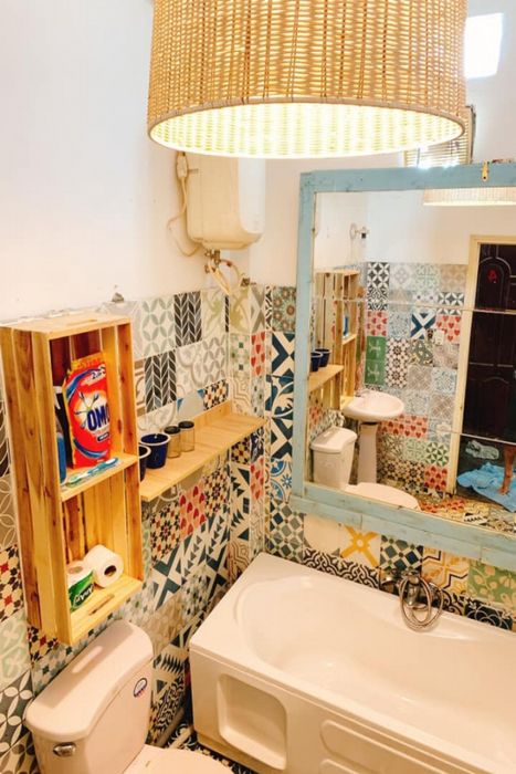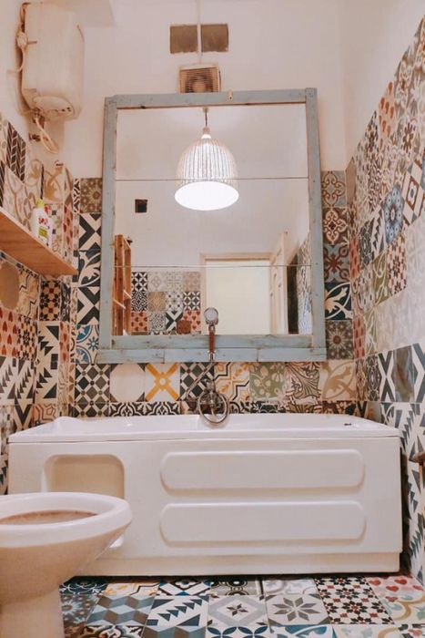 Phòng tắm với hoa văn sặc sỡ chắc chắn sẽ mang đến cảm giác thoải mái, đồng thời bồn tắm cũng là một điểm đặc biệt của homestay này.