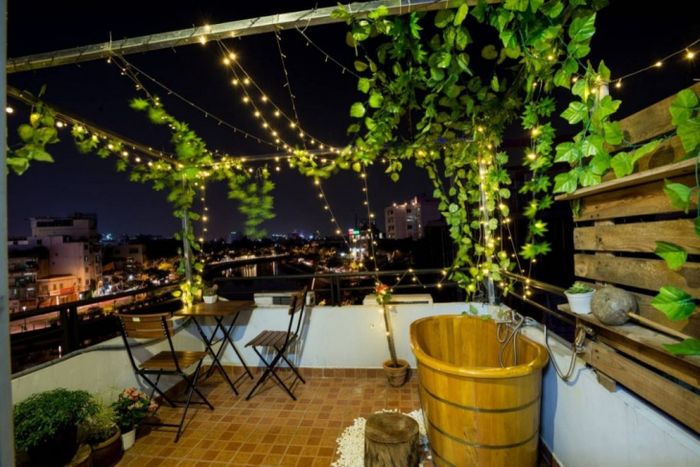 Tầng áp mái biến thành khu nghỉ dưỡng tuyệt vời. Bàn ghế, cây xanh tạo không khí thư giãn, đặc biệt có bồn tắm gỗ phục vụ cho những tín đồ sống ảo.