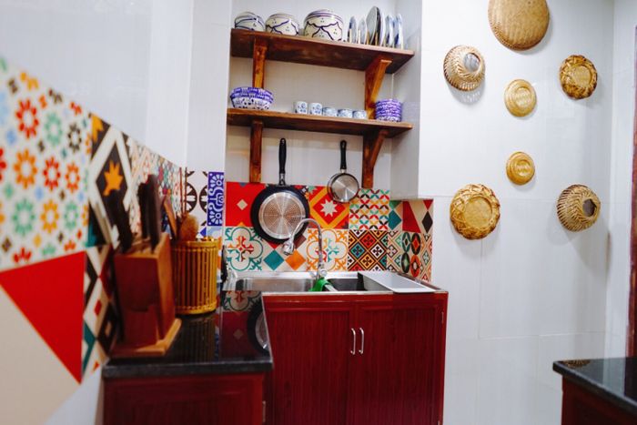 Giấy dán tường với màu sắc hoa văn độc đáo, trong khi những chiếc giỏ mây treo trên tường mang lại cảm giác nhẹ nhàng và hoài cổ. Bát đĩa, ấm chén cổ điển cũng rất tinh tế.